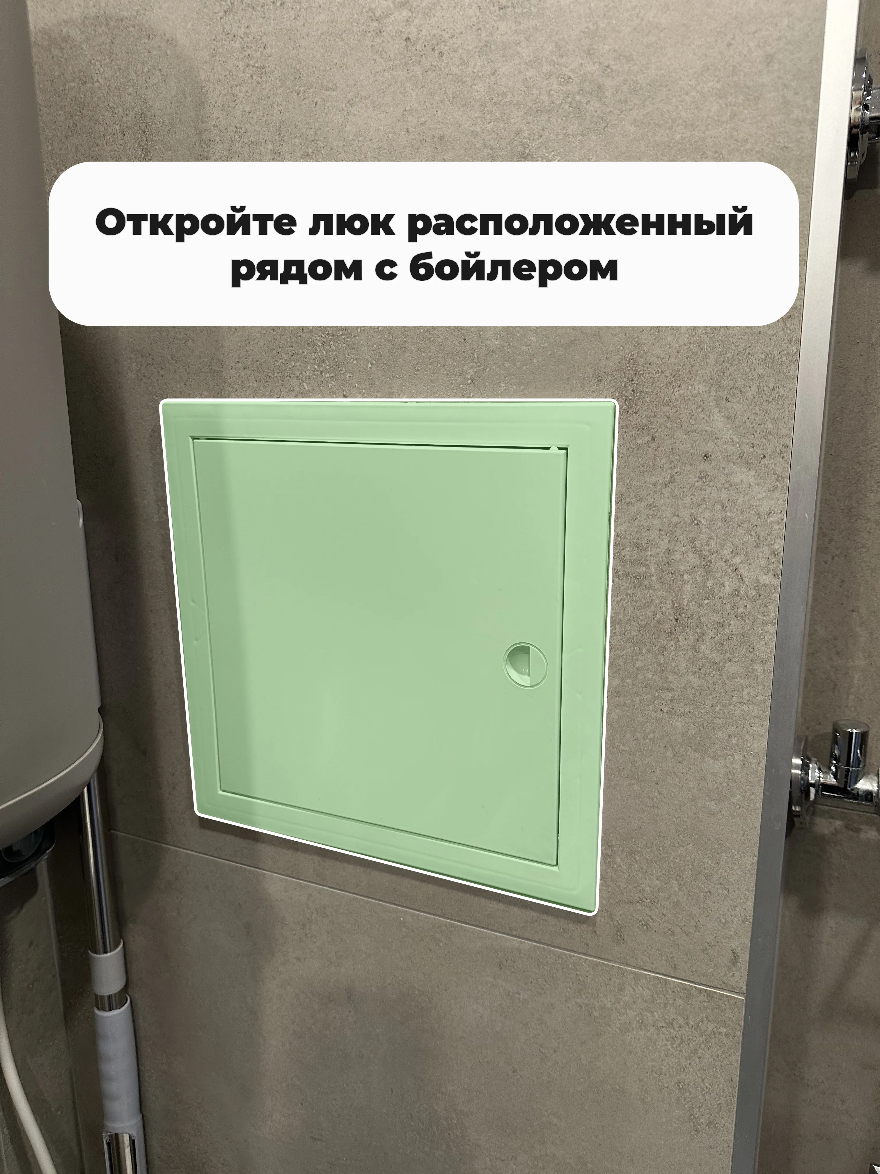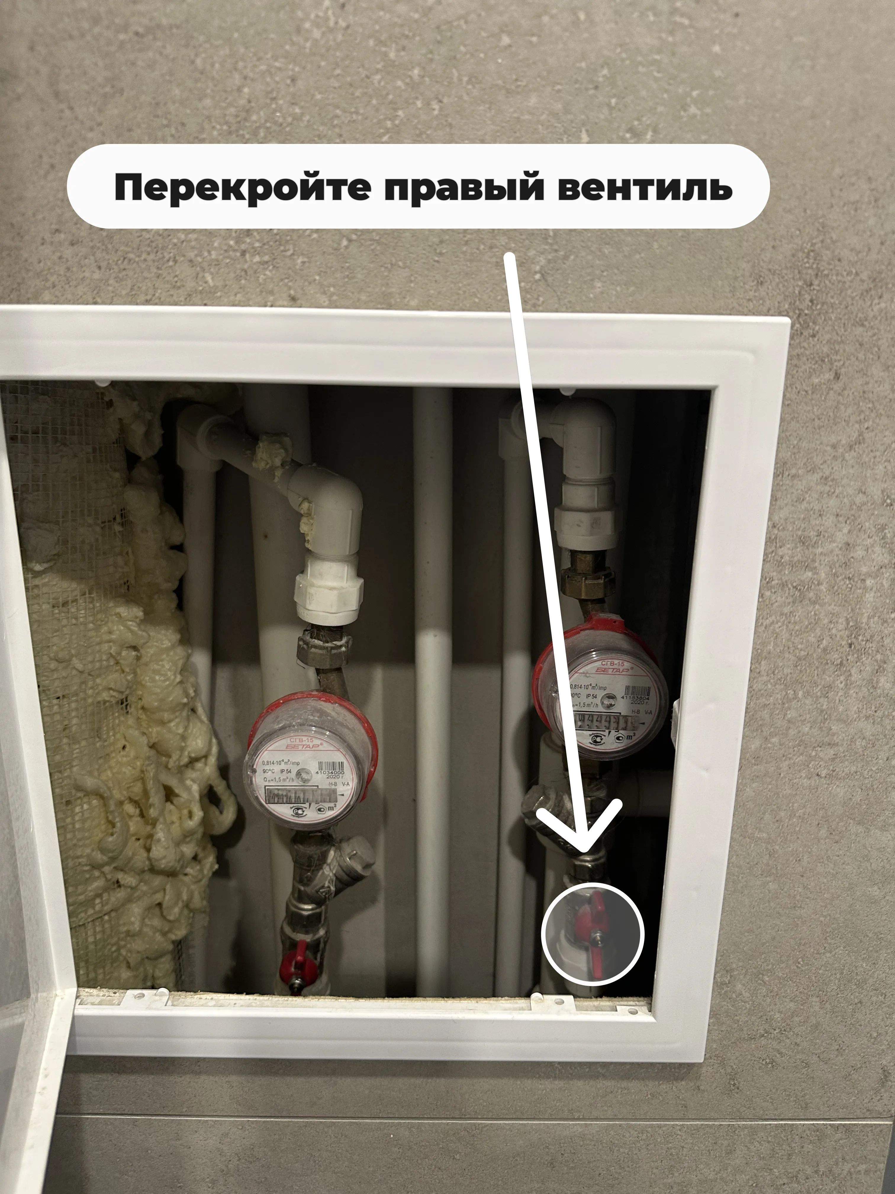 - (Фото 1) Перекройте подачу горячей воды (труба в в люке у стены).