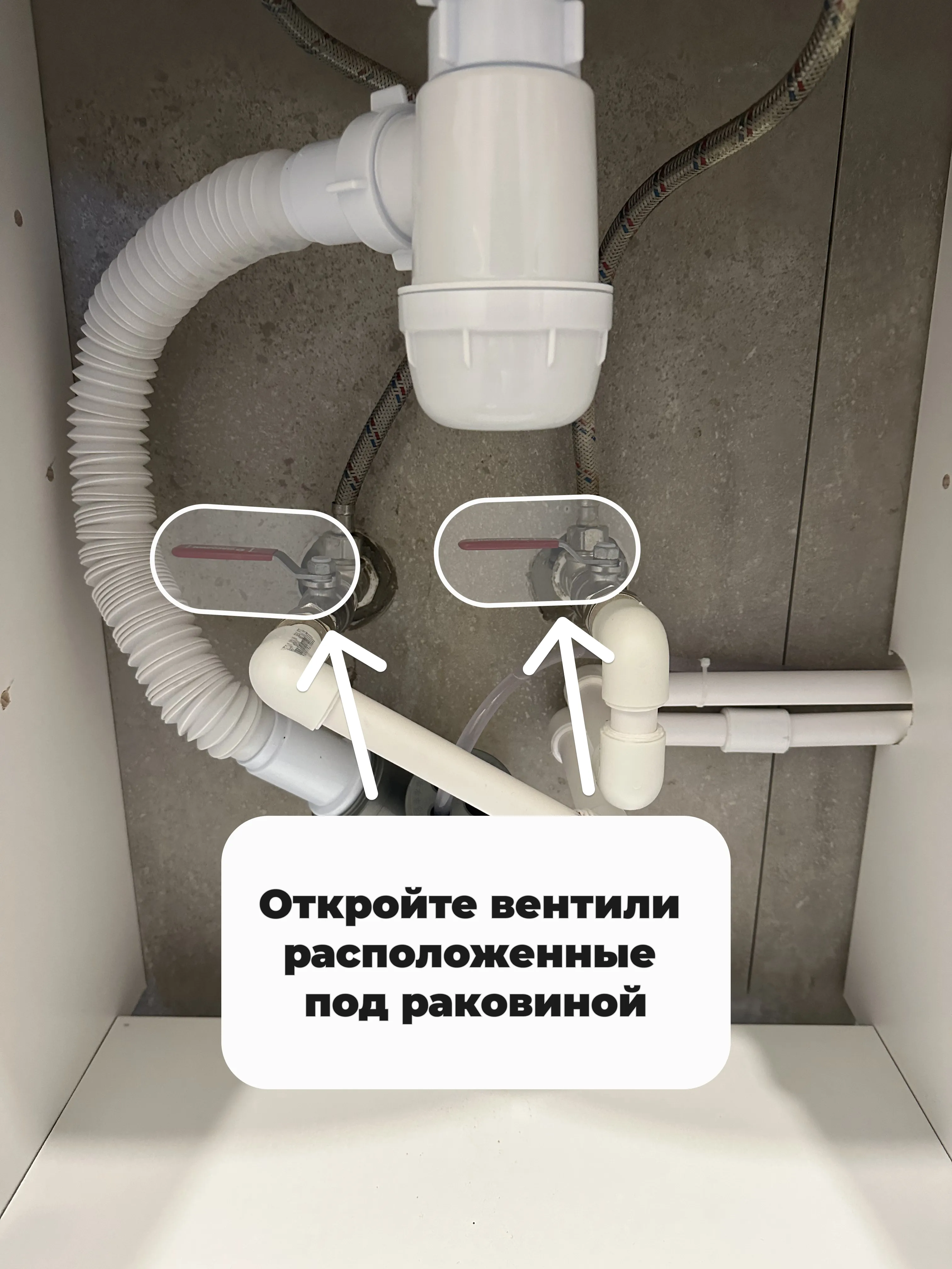 - (Фото 2) Откройте краны подачи воды с бойлера (расположены под раковиной).