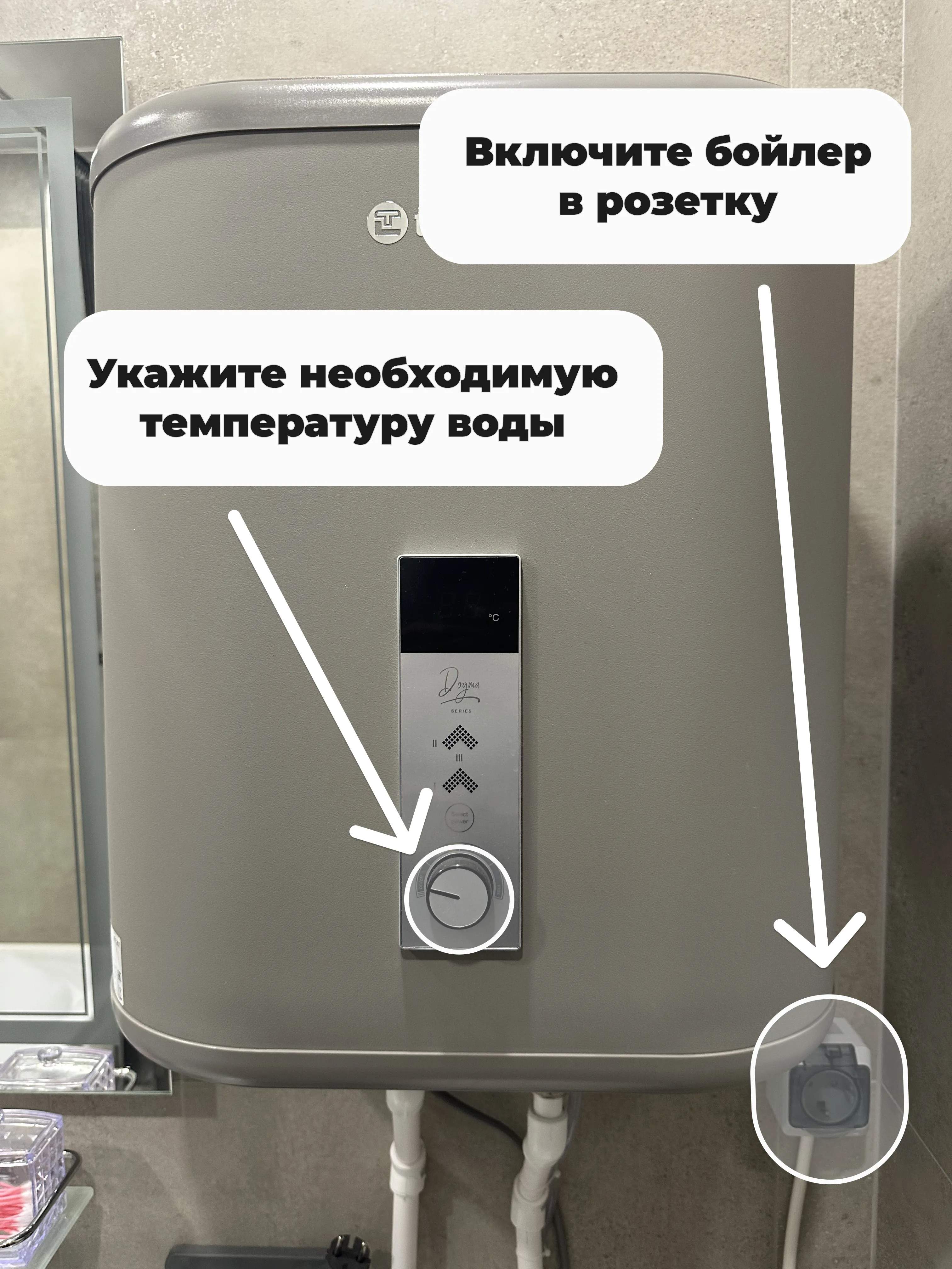 - (Фото 3) Подключите бойлер к питанию, вставив вилку в розетку.